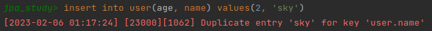 name 필드에 중복된 값을 insert 해보자. 그러면 아래와 같은 오류가 발생한다.