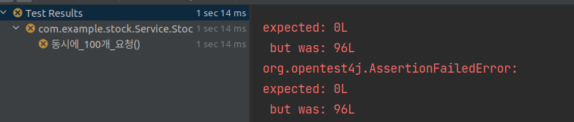 100개의 재고를 100개의 스레드에서 1씩 감소시켰기에 재고는 0이 될거라 예상했지만, 96개의 재고가 남아있는 결과가 나왔다. 원인은 race condition이 일어났기 때문인다. 두 개 이상의 스레드가 공유 데이터에 접근할 수 있고, 공유 데이터를 동시에 변경하려 했기 때문에 예상과 다른 결과가 나왔다.