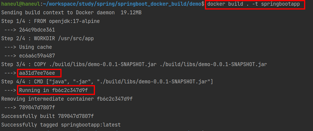 첫번째 Docker Image 빌드이므로, Dockerfile의 각 명령어에 대한 레이어가 생성된다.